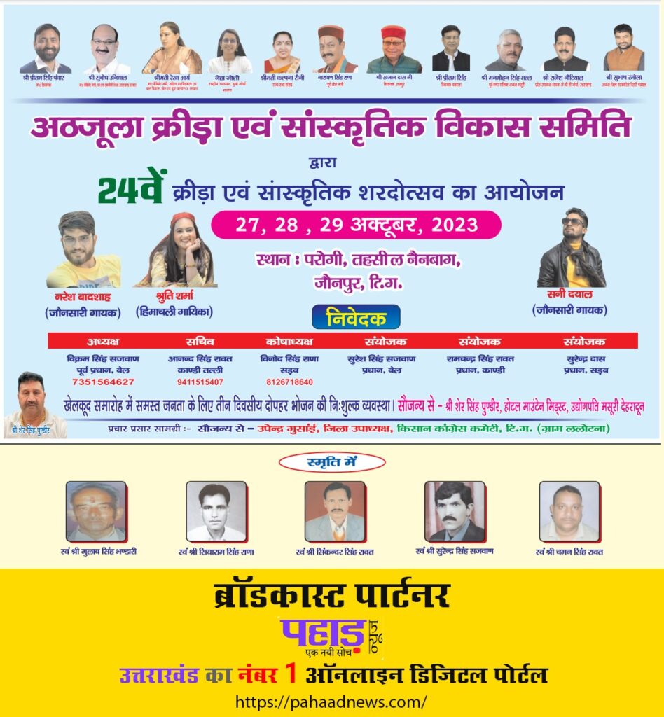 जिलाधिकारी मयूर दीक्षित द्वारा शनिवार को परोगी नैनबाग जौनपुर टिहरी गढ़वाल पहुंचकर 24वें क्रीड़ा एवं सांस्कृतिक शरदोत्सव में मुख्य अतिथि के रूप में प्रतिभाग किया गया। अठ जूला क्रीड़ा एवं सांस्कृतिक विकास समिति द्वारा आयोजित शरदोत्सव कार्यक्रम में जिलाधिकारी द्वारा बहुउद्देशीय शिविर का रिबन काटकर उद्घाटन किया गया।
