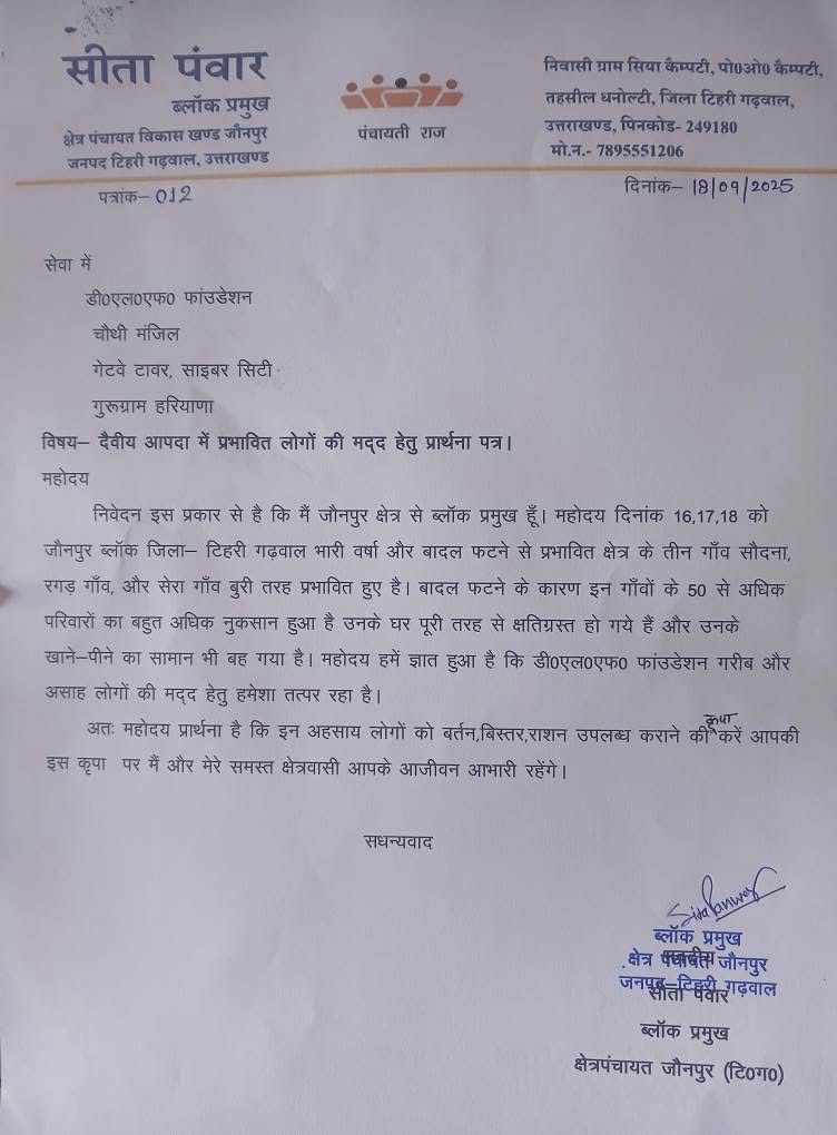 बादल फटने की घटना के चलते कई परिवारों की रोज़मर्रा की आवश्यक वस्तुएं मलबे में बह गईं। ऐसे में #DLF_Foundation की सहायता से जरूरतमंद परिवारों को राशन, बिस्तर और बर्तन जैसी आवश्यक सामग्री उपलब्ध कराई गई।